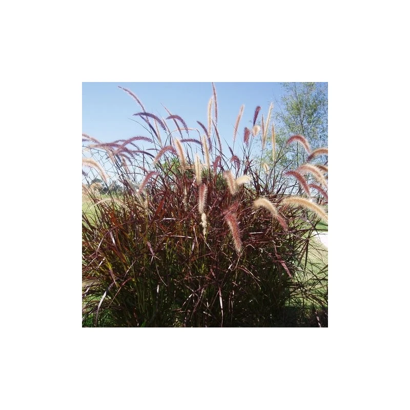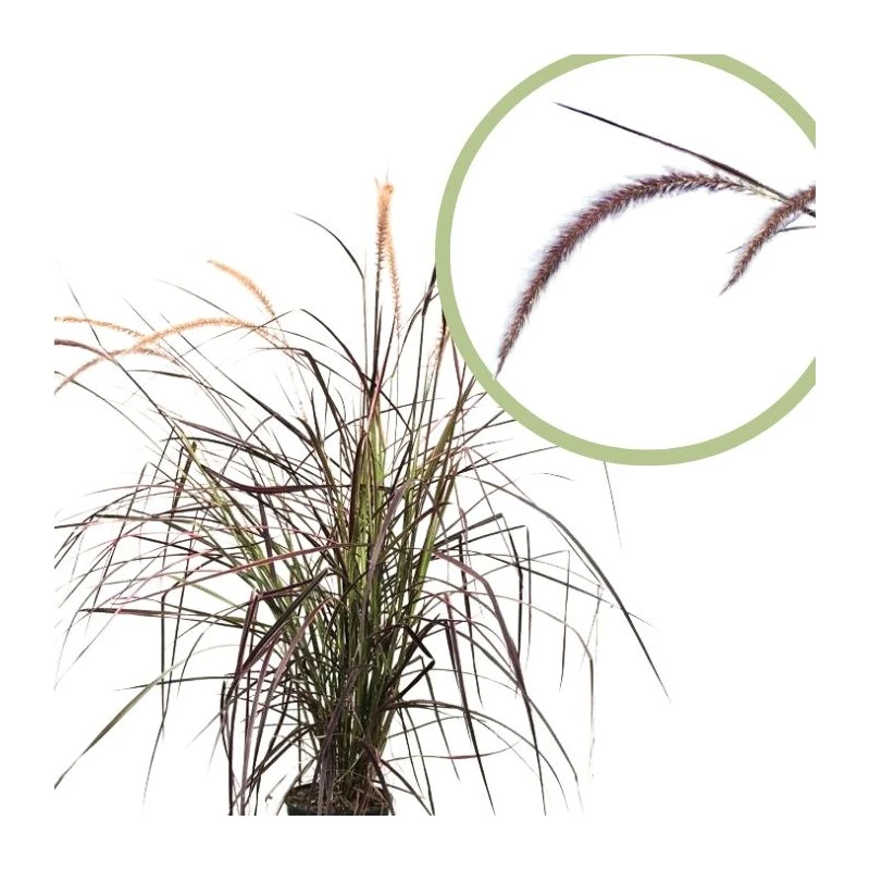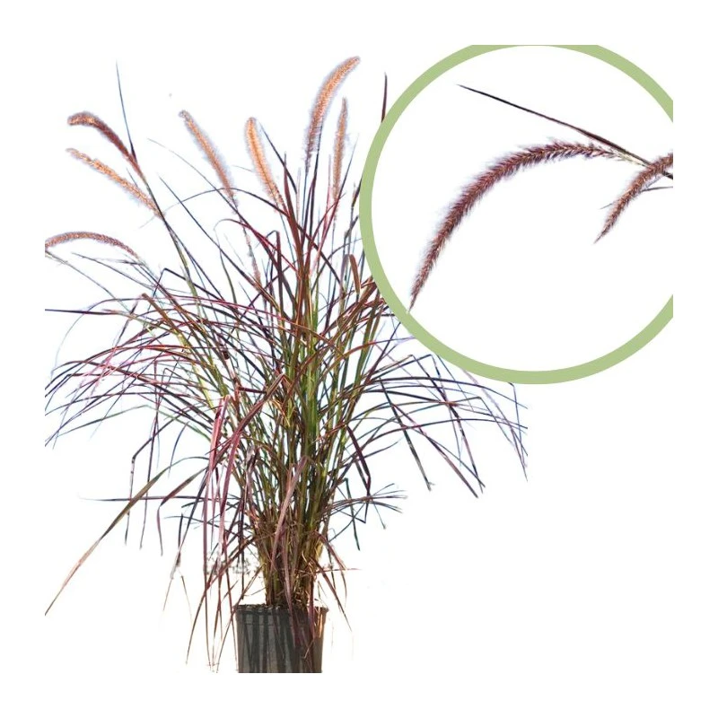 Pennisetum setaceum Rubrum» La planta es famosa por su llamativo follaje de color burdeos a púrpura y sus atractivas espigas de flores en forma de cepillo de botella, es conocida como hierba de fuente púrpura o hierba de fuente roja.