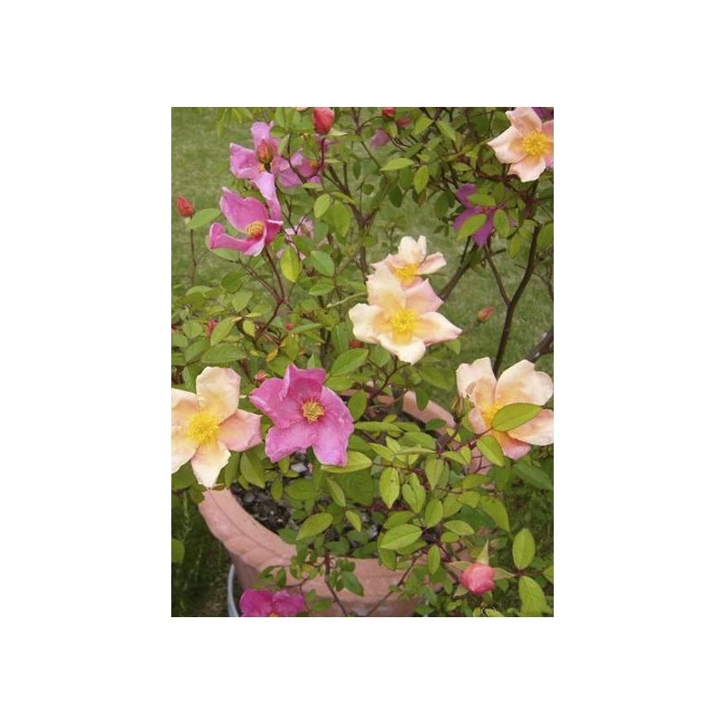 Rosal rugosa Chinensis mutabilis sus flores tienen cinco pétalos de color amarillento a rosa.